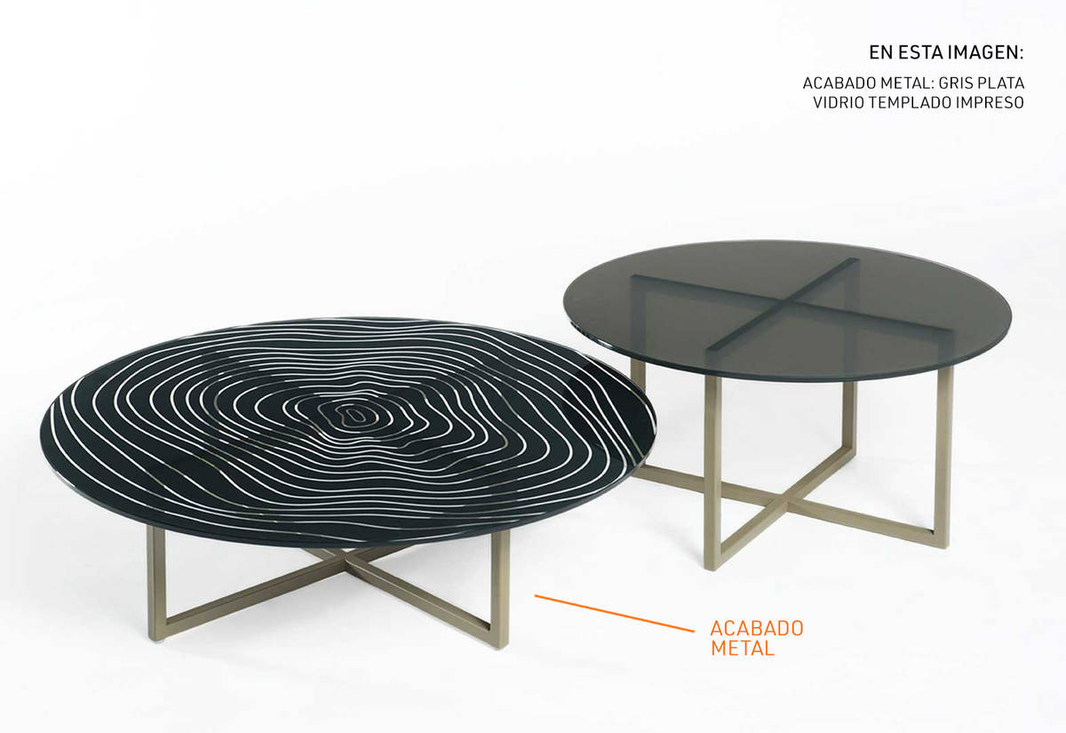 Mesa de Centro de vidrio templado impreso de 10 mm y base de metal con pintura anti corrosiva en acabado chocolate o gris plata. Diseño monocromatico en con muchas curvas. Ideal para dar un toque moderno a cualquier ambiente. Muy fácil de limpiar